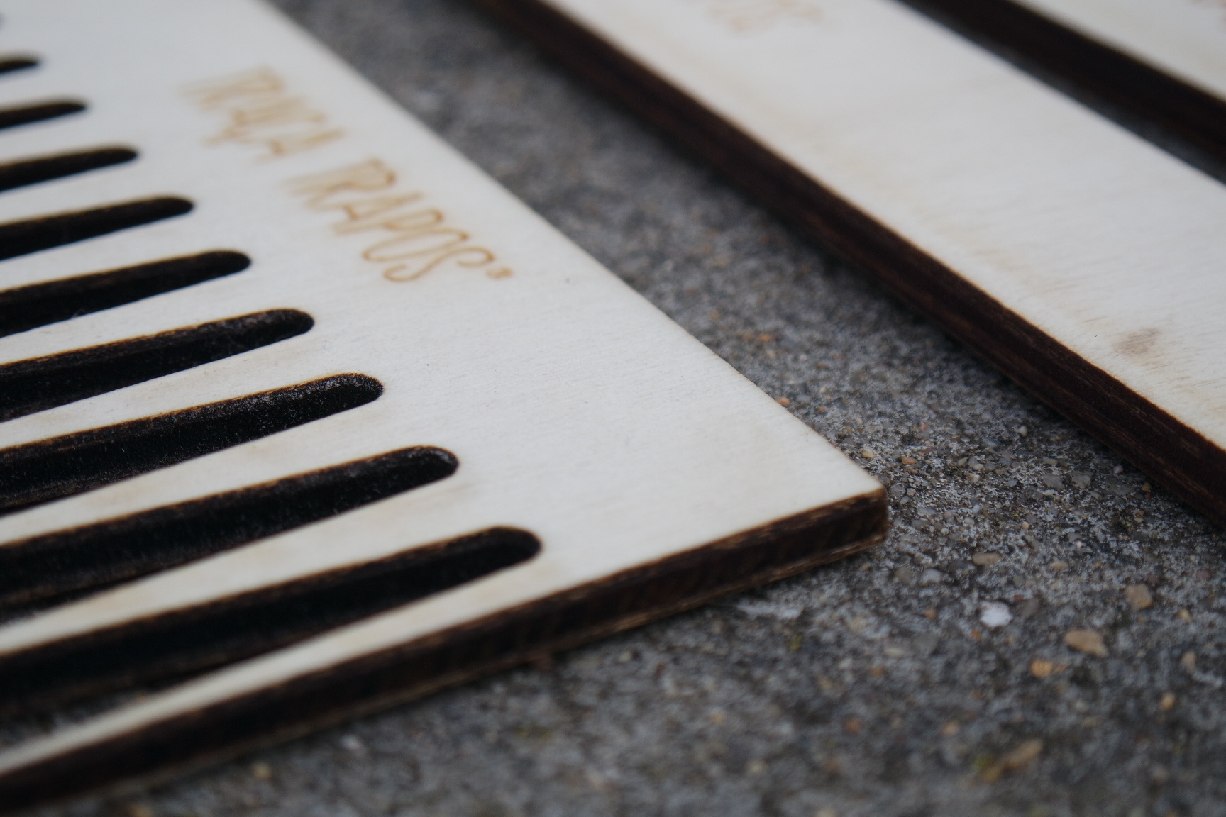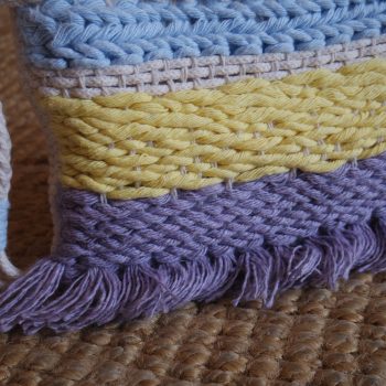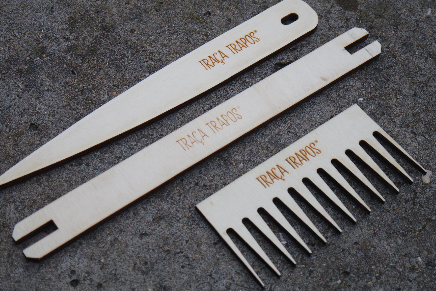 Conjunto para tecelagem em madeira MDF. Contém um pente, uma agulha para tecelagem com bico e uma agulha rectangular.