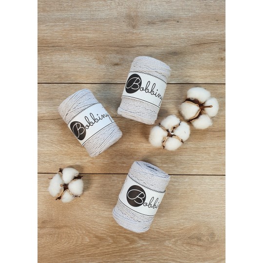 Este fio da Bobbiny é uma corda de algodão 3ply composta por 30 fios individuais divididos em 3 partes de (10cabos cada) e depois enrolados entre si. Esta estrutura resulta numa corda forte, fácil de trabalhar e de desfiar, permitindo obter franjas cheias e estruturadas. É perfeito para pequenos projectos como acessórios e joalheria ou para juntar a peças maiores como um pormenor ou detalhe. Pode também ser usado com outras técnicas, como crochet e tecelagem.