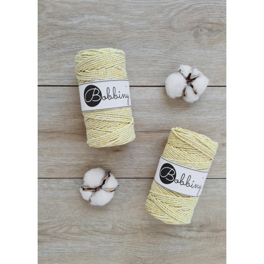 Este fio da Bobbiny é uma corda de algodão 3ply composta por 60 fios individuais divididos em 3 partes de (20cabos cada) e depois enrolados entre si. Esta estrutura resulta numa corda forte, fácil de trabalhar e de desfiar, permitindo obter franjas cheias e estruturadas. É perfeito para fazer decorações festivas, peças centrais e outros projetos decorativos.