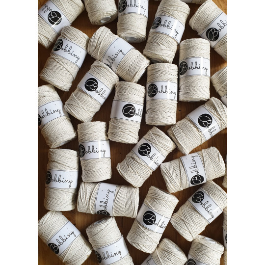 Este fio da Bobbiny é uma corda de algodão 3ply composta por 60 fios individuais divididos em 3 partes de (20cabos cada) e depois enrolados entre si. Esta estrutura resulta numa corda forte, fácil de trabalhar e de desfiar, permitindo obter franjas cheias e estruturadas. É perfeito para fazer decorações festivas, peças centrais e outros projetos decorativos.