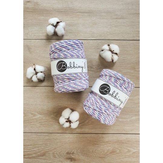 Este fio da Bobbiny é uma corda de algodão 3ply composta por 120 fios individuais divididos em 3 partes de (40cabos cada) e depois enrolados entre si. Esta estrutura resulta numa corda forte, fácil de trabalhar e de desfiar, permitindo obter franjas cheias e estruturadas. É perfeito para fazer decorações festivas, peças centrais e outros projetos decorativos.