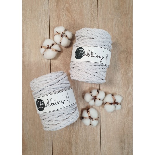 A corda de algodão 3ply de 9mm da Bobbiny é uma excelente escolha para quem gosta de grandes projetos. É extremamente macio e espesso ao mesmo tempo, e diâmetro torna-o muito rápido e agradável de trabalhar. Desfia com relativa facilidade, o que permite criar franjas preenchidas e acabamentos com um toque macio. É ideal para projetos de macramé XXl, mas também tem diversas maneiras de aplicar na tecelagem e em alguns trabalhos de crochet.