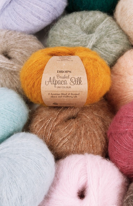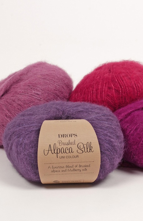 O super suave DROPS Alpaca Silk tem um sofisticado mostruário de cores que vão do bege claro e de suaves tons de cinzento a espectulares vermelhos e roxos.