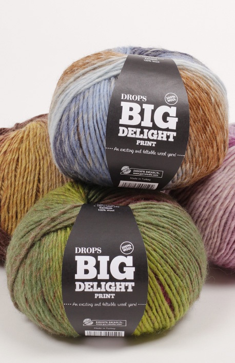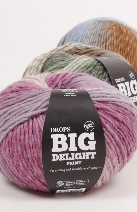 Uma lã de 1 fio confortável e super macia, o DROPS Big Delight é a continuação do DROPS Delight numa espessura mais grossa, fiado da mesma maneira, mas em 100% lã e apresentado em novelos de 100 gr. O estampado multicolor, com longas repetições das cores, cria motivos únicos e fantásticas combinações de cores, o que significa que pode haver variações mais claras ou mais escuras dos tons num mesmo lote de tingimento. Isto não é uma falha ou um defeito, mas, sim, parte do carácter único do fio.
