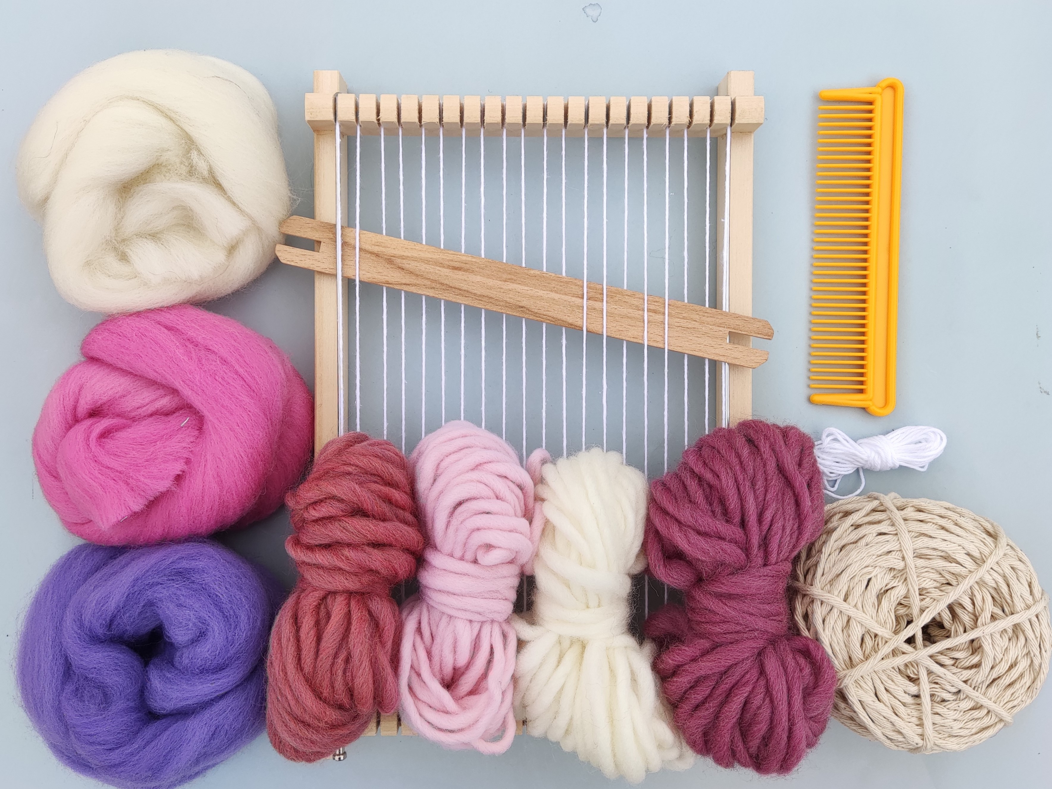 Kit para iniciação à tecelagem com tudo o que é essencial para aprender e criar as suas próprias peças.