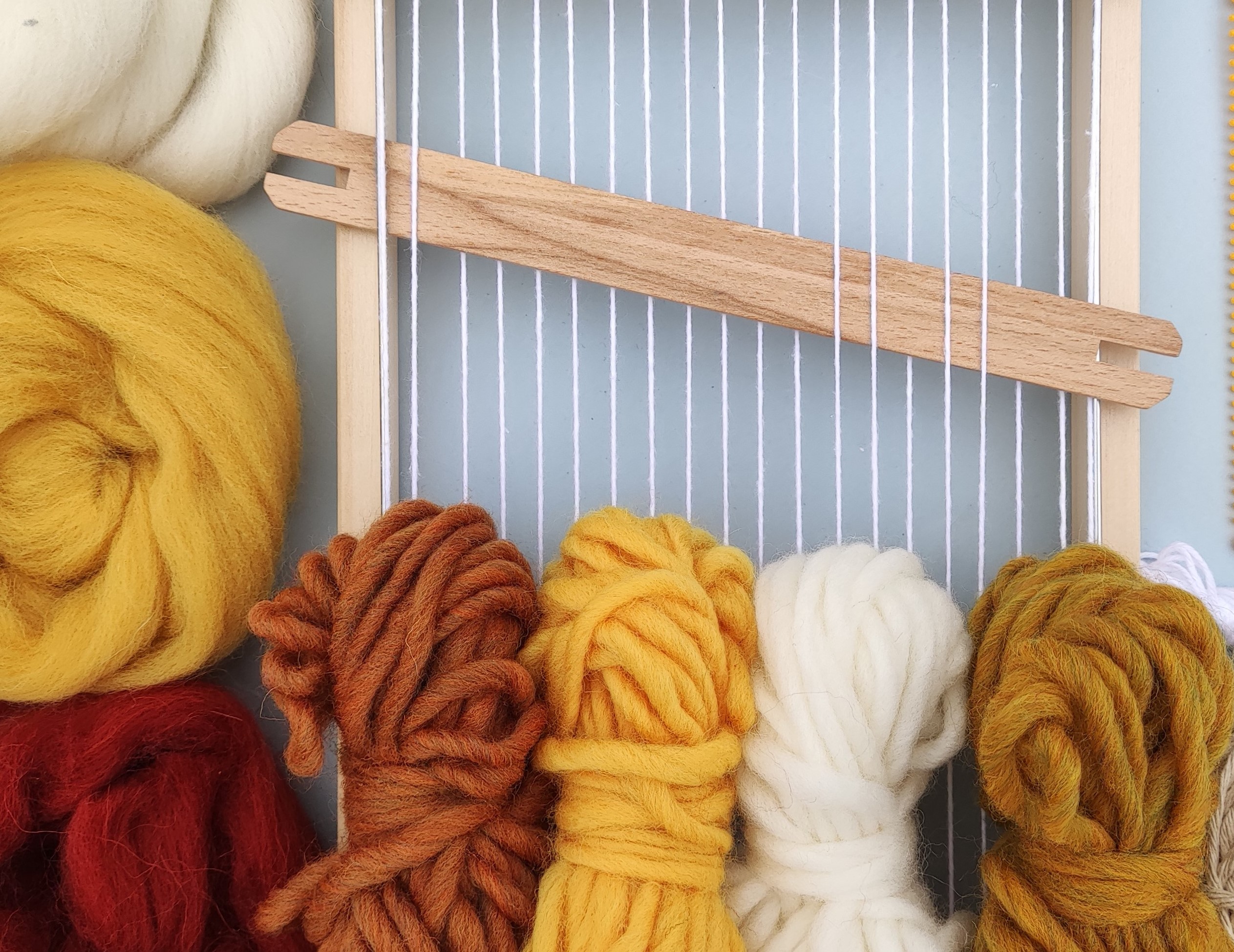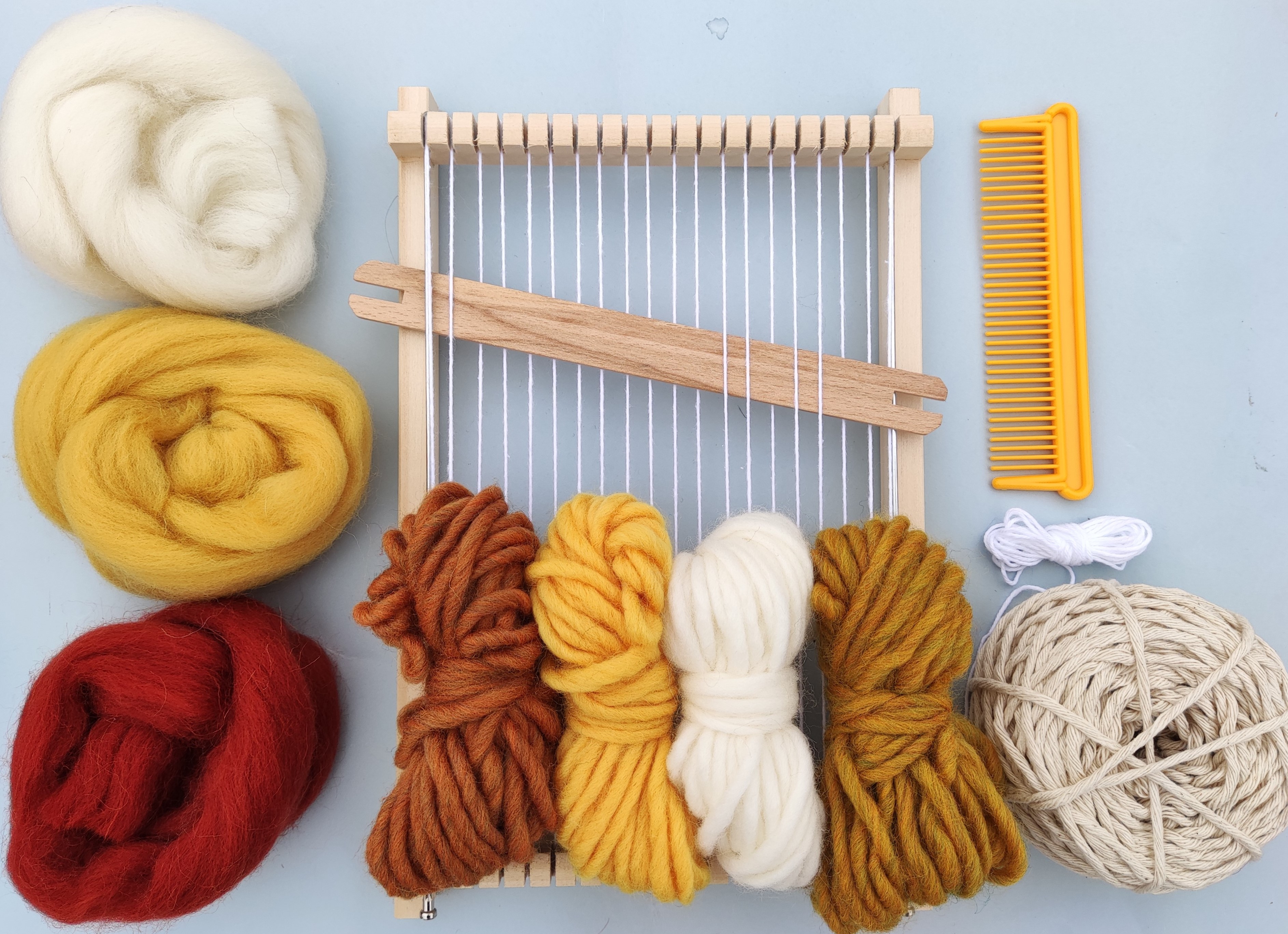 Kit para iniciação à tecelagem com tudo o que é essencial para aprender e criar as suas próprias peças.