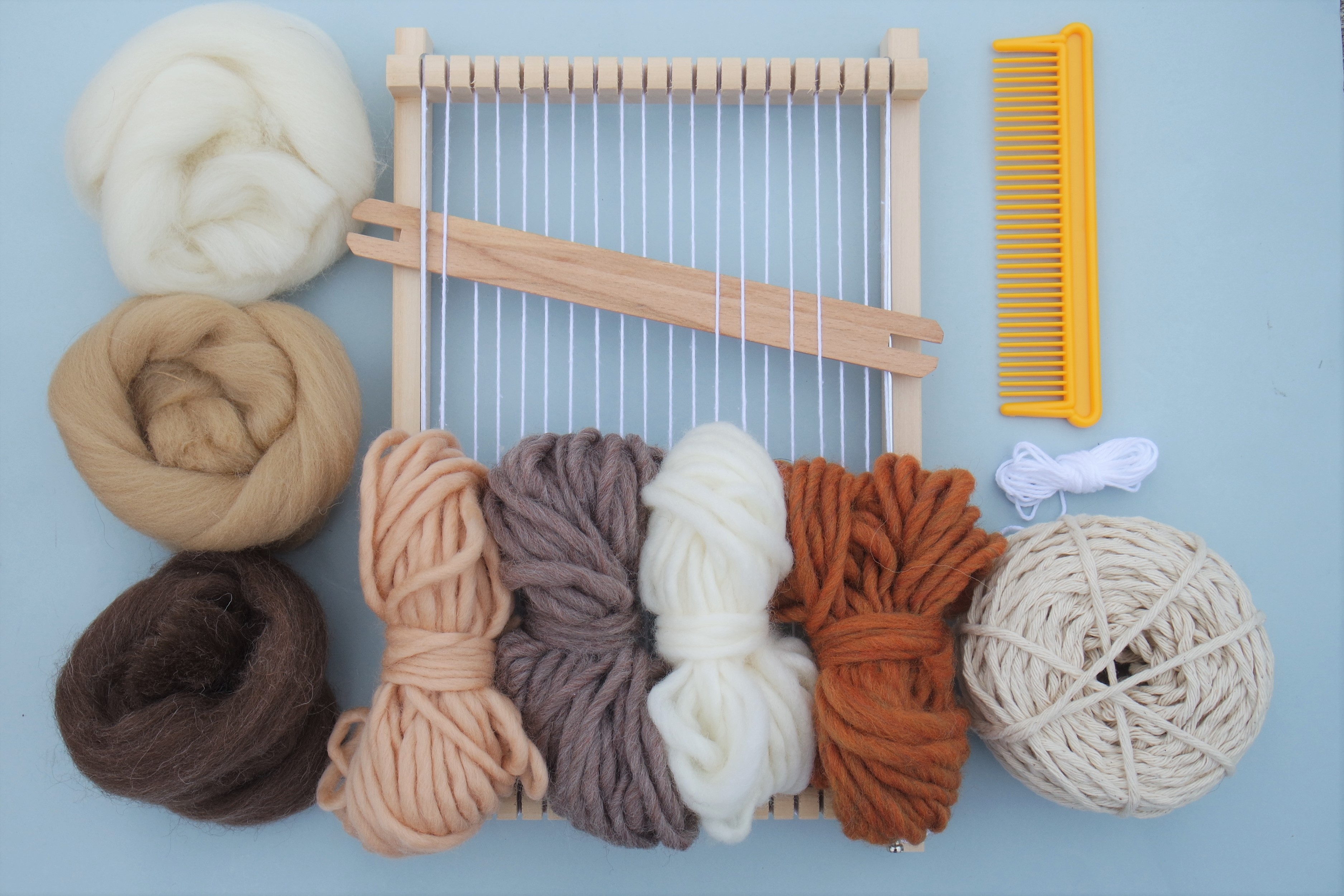 Kit para iniciação à tecelagem com tudo o que é essencial para aprender e criar as suas próprias peças.