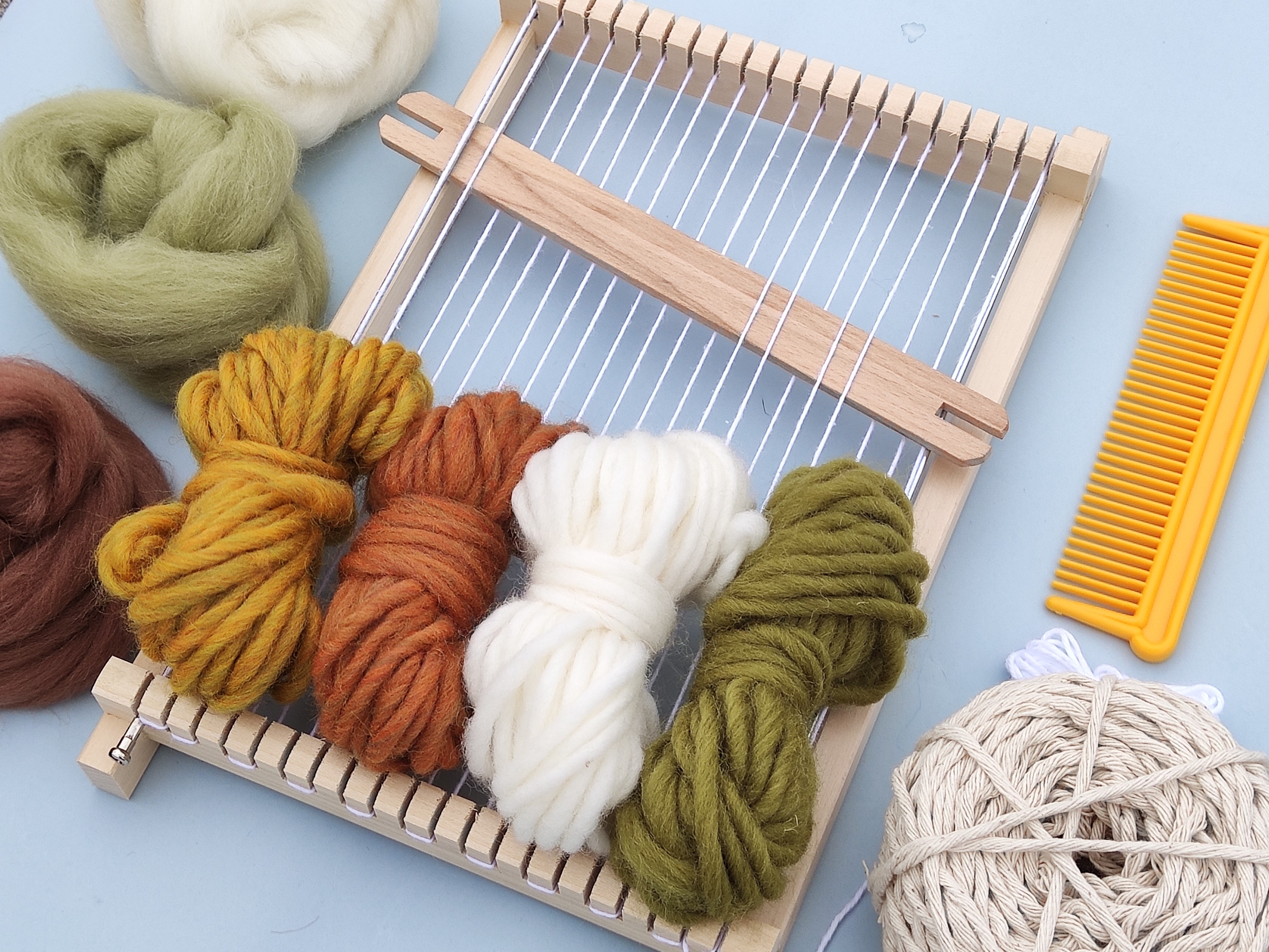Kit para iniciação à tecelagem com tudo o que é essencial para aprender e criar as suas próprias peças.