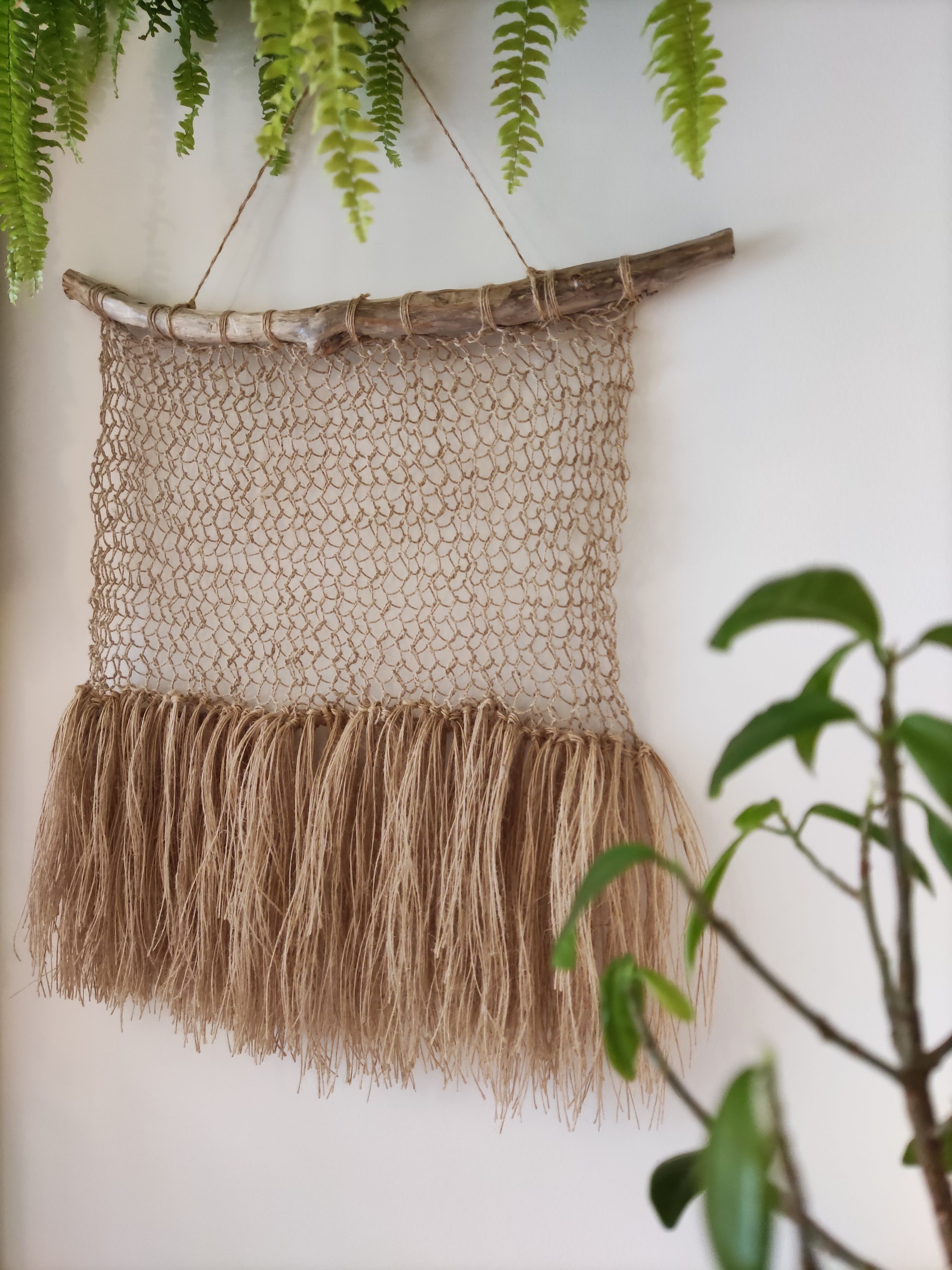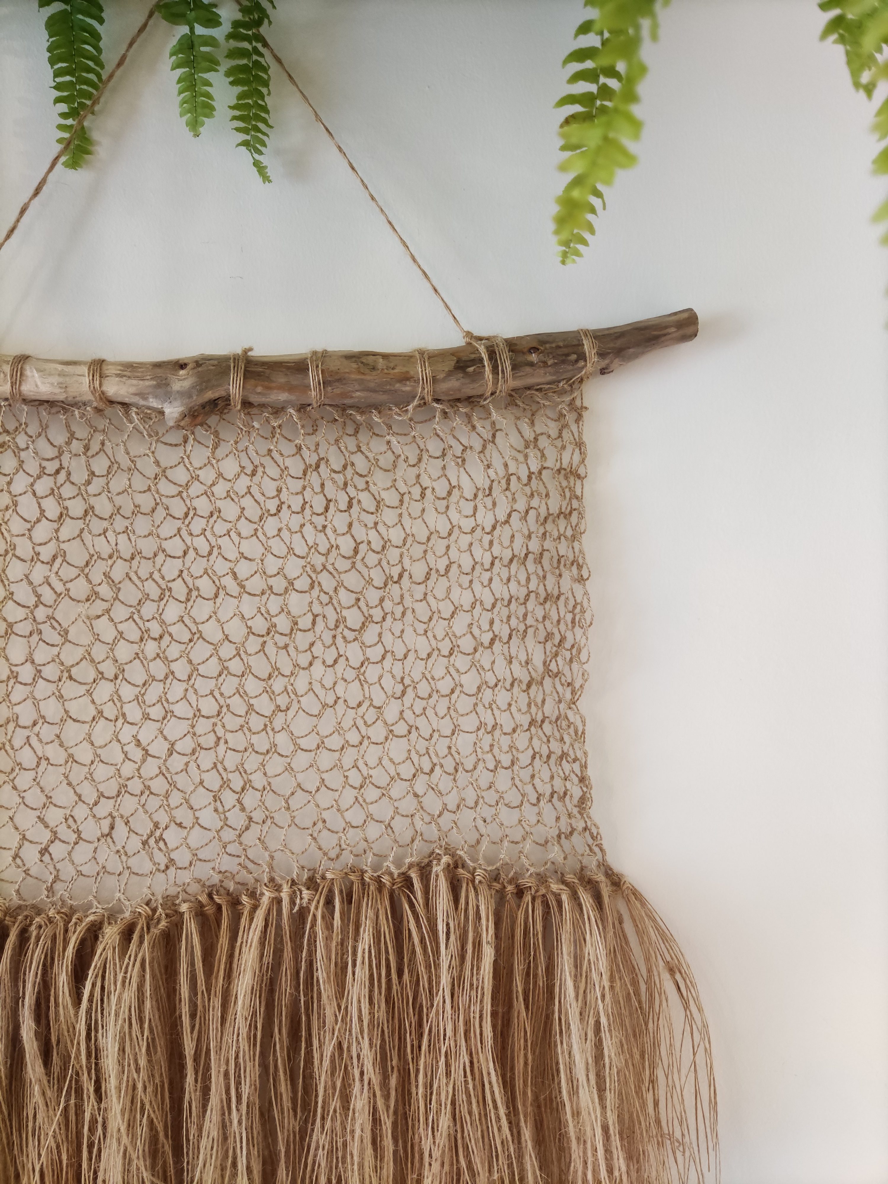 Este simples mas magnifico painel artesanal feito em tricot é uma peça tridimensional e cheia de pormenores. Feita inteiramente com juta. Todas as peças da Traça são feitas inteiramente à mão e nenhuma peça é igual a outra. Também fazemos por medida, entre em contacto connosco sobre aquela peça com que sempre sonhou.