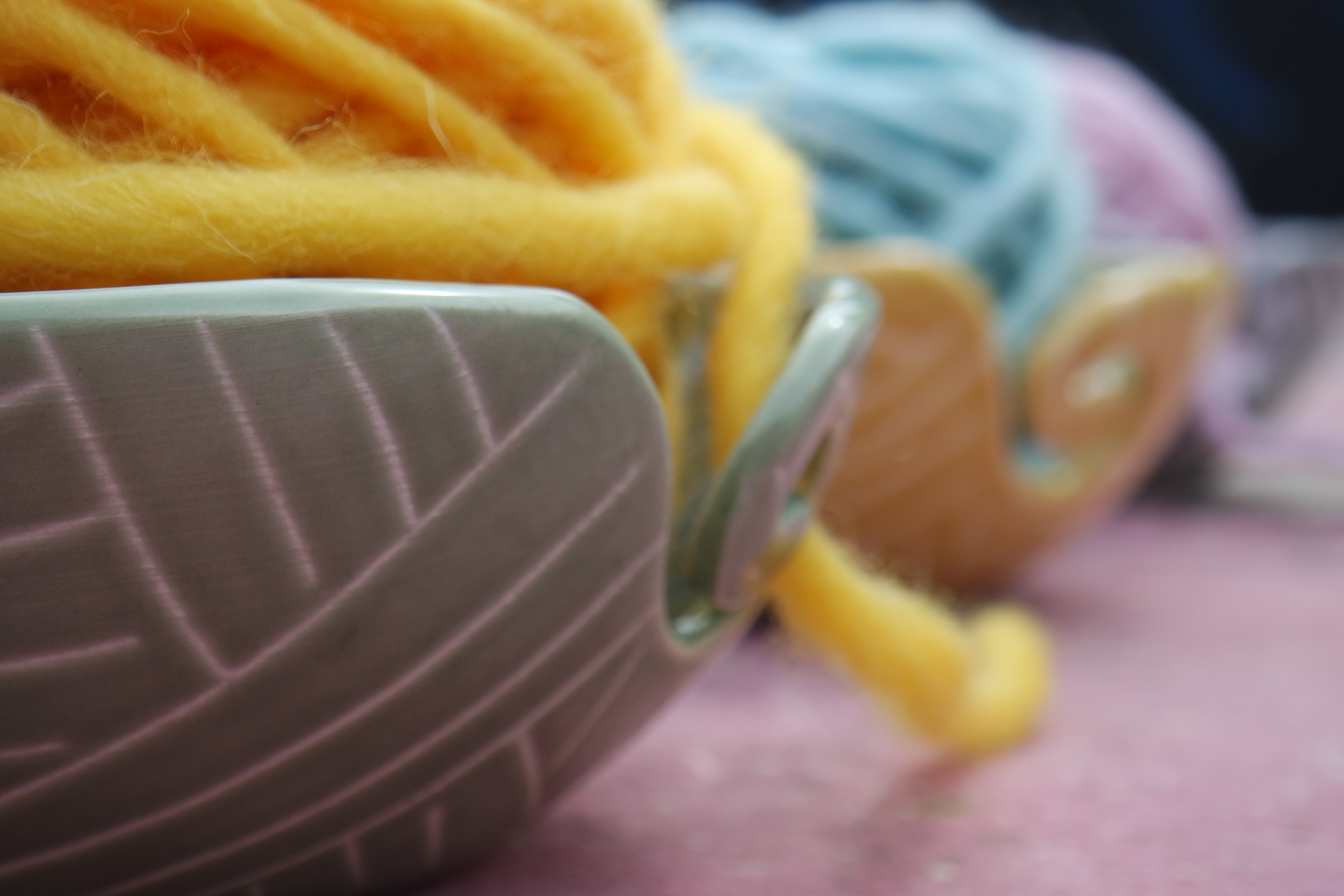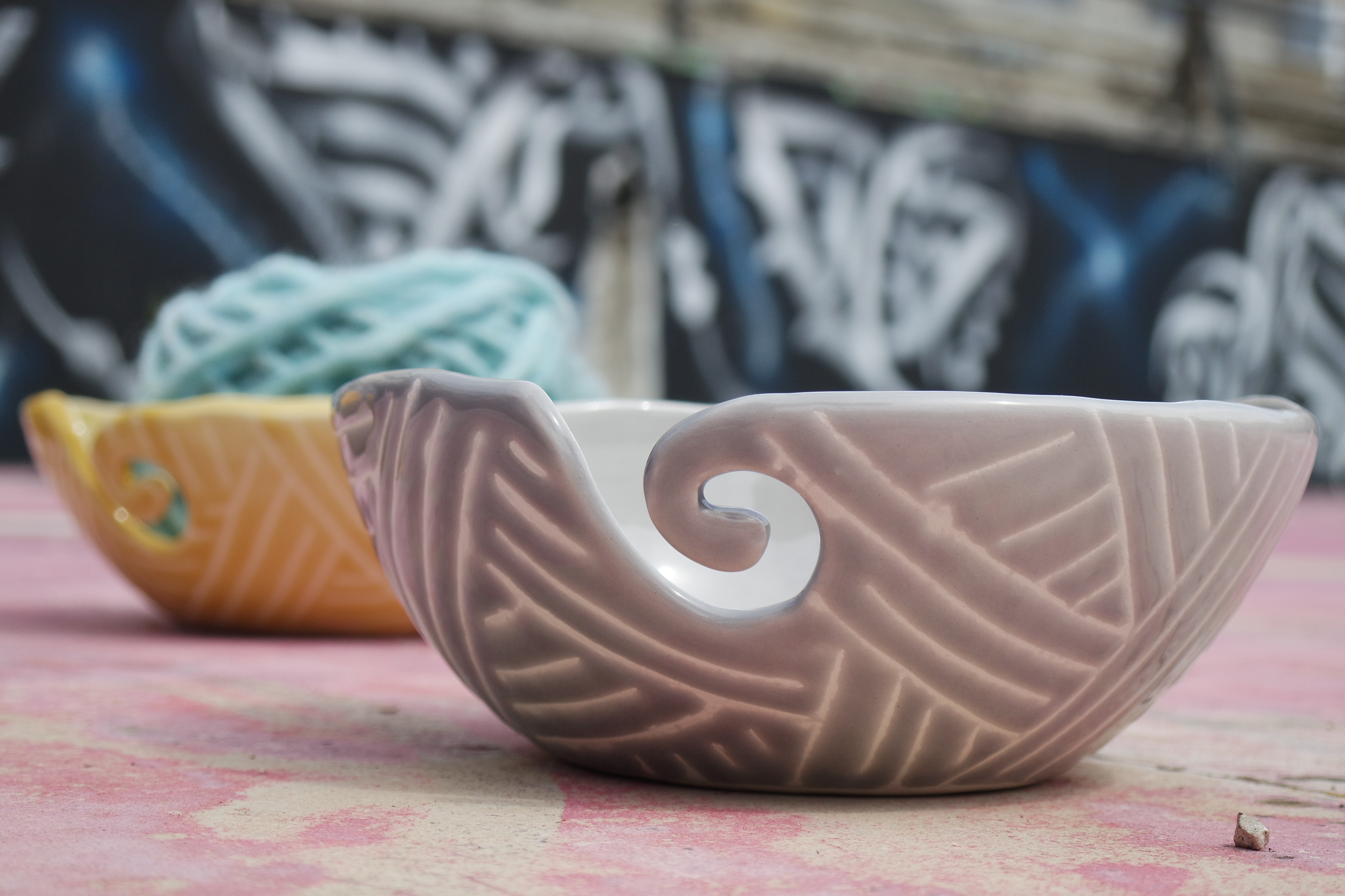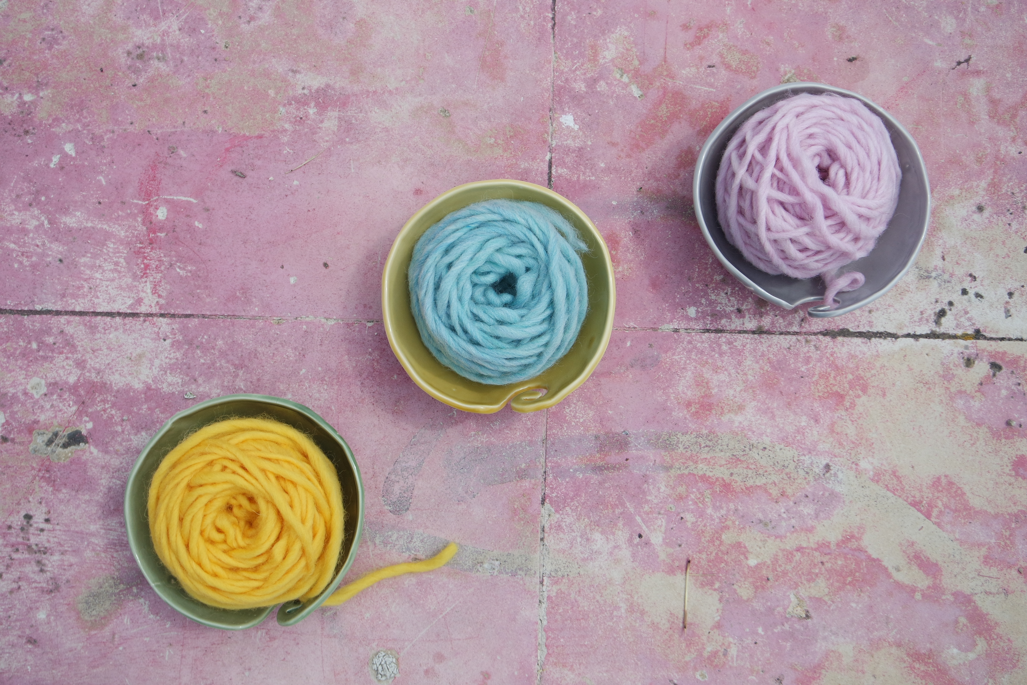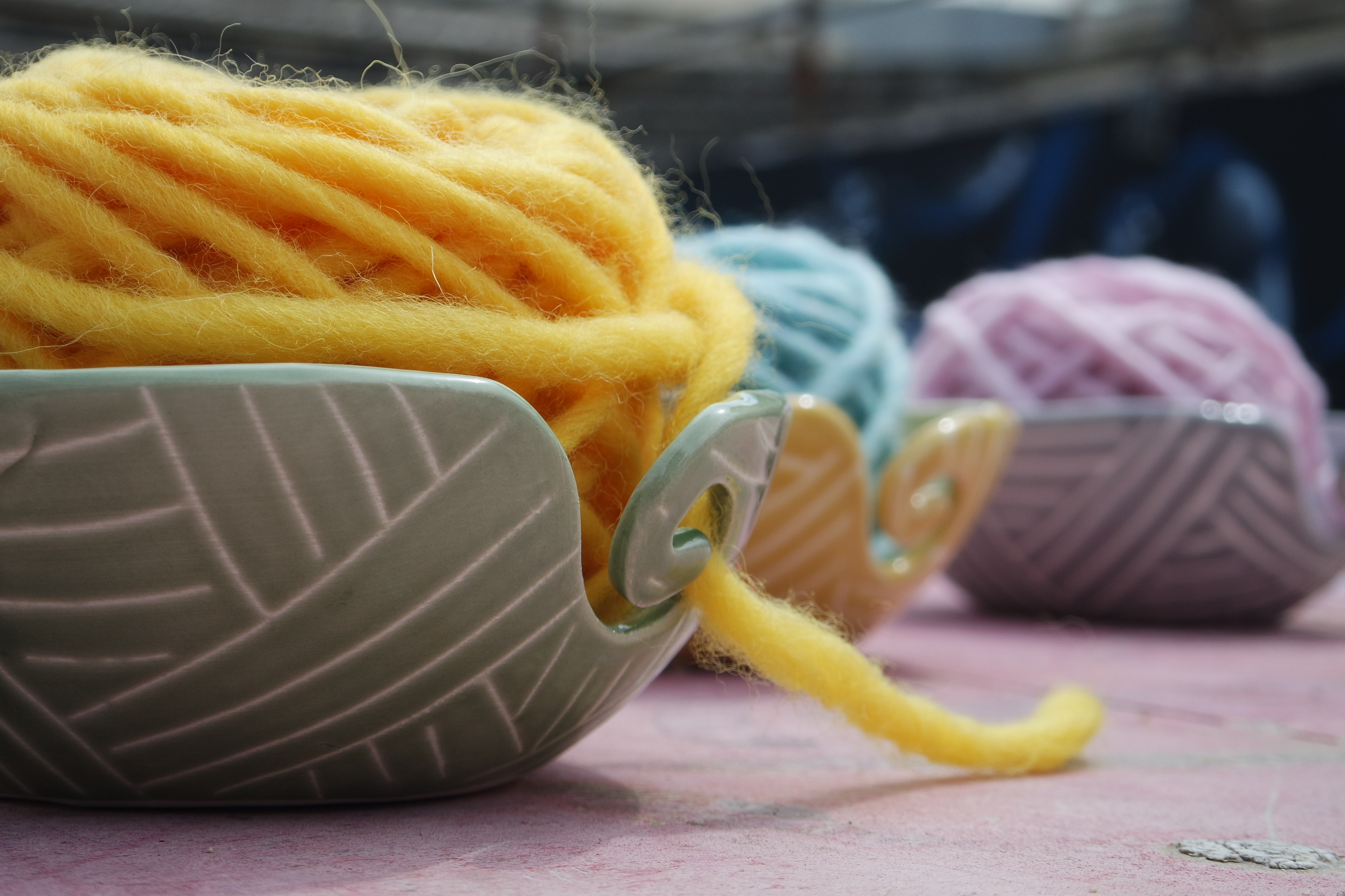 Porta novelos em cerâmica que permite desenrolar e segurar os novelos enquanto se trabalha a lã ou o algodão. Disponível em 4 cores.