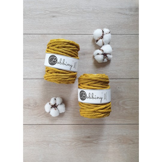 O fio de algodão torcido de 9mm da Bobbiny é uma excelente escolha para quem gosta de grandes projetos. É extremamente macio e espesso ao mesmo tempo, e diâmetro torna-o muito rápido e agradável de trabalhar. Desfia com relativa facilidade, o que permite criar franjas preenchidas e acabamentos com um toque macio. É ideal para projetos de macramé XXl, mas também tem diversas maneiras de aplicar na tecelagem e em alguns trabalhos de crochet.